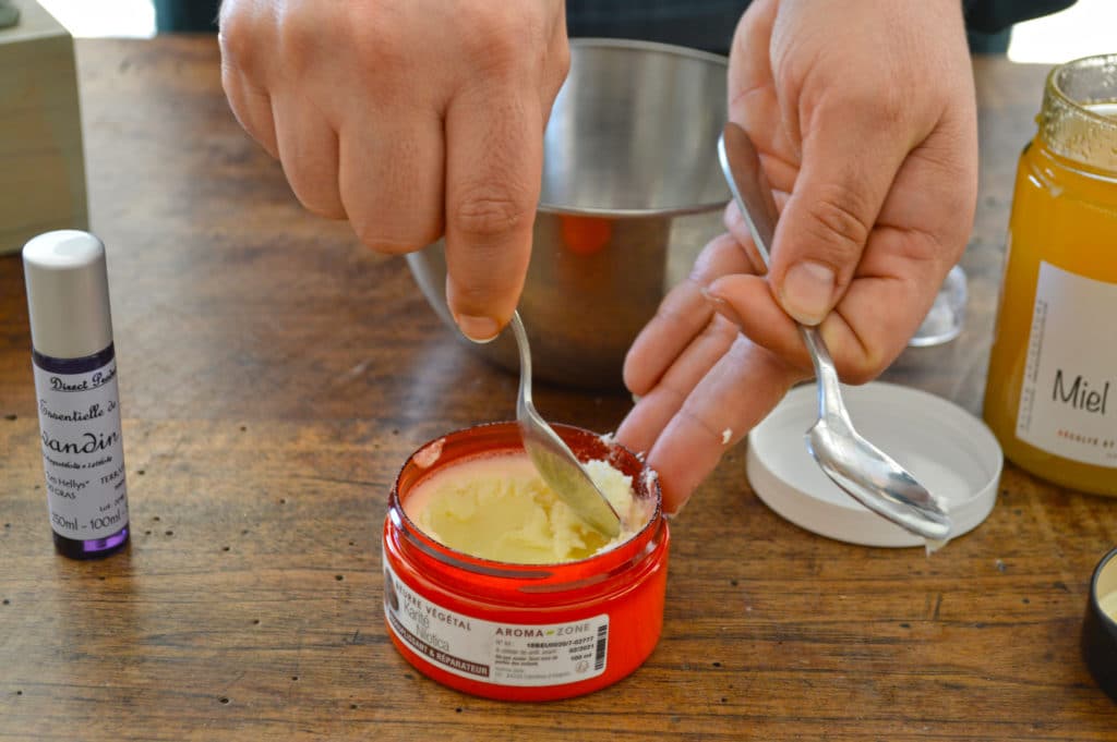 Dans un bol, mettre le miel et le beurre de karité. Bien remuer afin d’obtenir une texture crémeuse et homogène. Ajouter ensuite l’huile essentielle de lavandin. Mélanger à nouveau. Verser votre baume dans un contenant avec bouchon ou couvercle