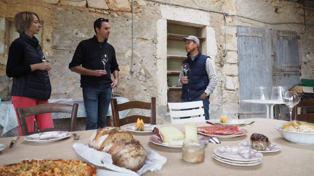 Enfin, arrive la dégustation, accompagnée d’un bon repas champêtre pris sous le préau. Nous avons eu la chance de goûter, en préalable de toute la gamme, un vin 100% muscat-petit-grain, unique et non commercialisé, au nez très fin mais au goût surprenant, puis, comment dire ? Les mots ne suffisent plus pour décrire ces moments de dégustation où se mêlent sensations subjectives et émotions diverses bercées par les histoires et explications érudites de ce vigneron hors norme (il crée même les étiquettes de ses bouteilles).