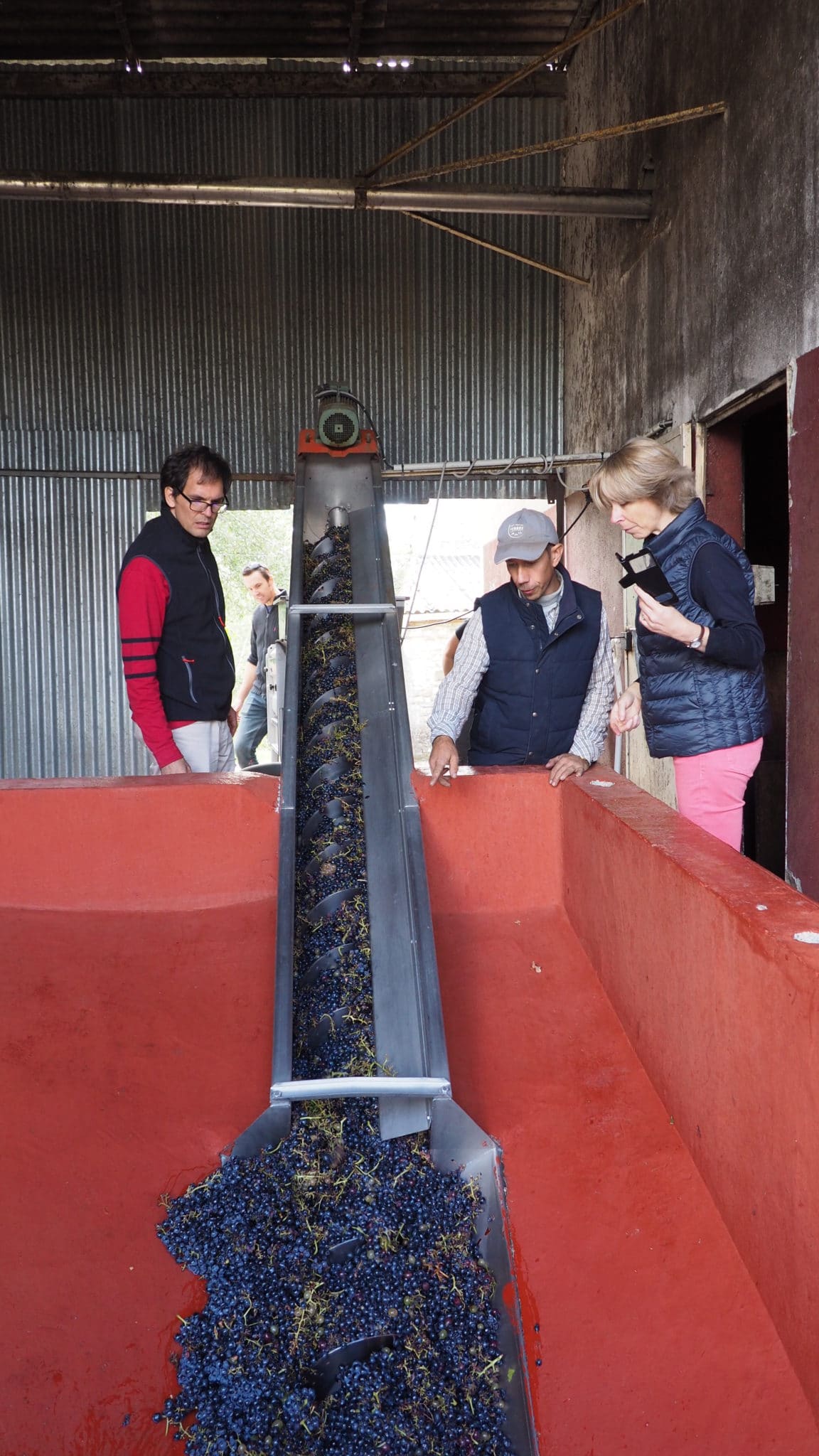 Il y a beaucoup de générosité de la part de notre hôte, car maintenant il va utiliser son matériel qui était tout propre pour accueillir nos baies. Celles-ci sont séparées de la rafle – après être envoyées par une géante vis sans fin – dans un appareil qui vaut le coup d’œil quant à son ingéniosité. Nous avons suivi les raisins jusque dans une des grandes cuves béton. Là encore, le flux d’explications ne tarit pas face aux multiples questions. Avant de passer à la dégustation, Frédéric accepte que nous l’aidions à nettoyer sceaux, cuve, vis sans fin, etc., comme si vous étions de vieux amis.