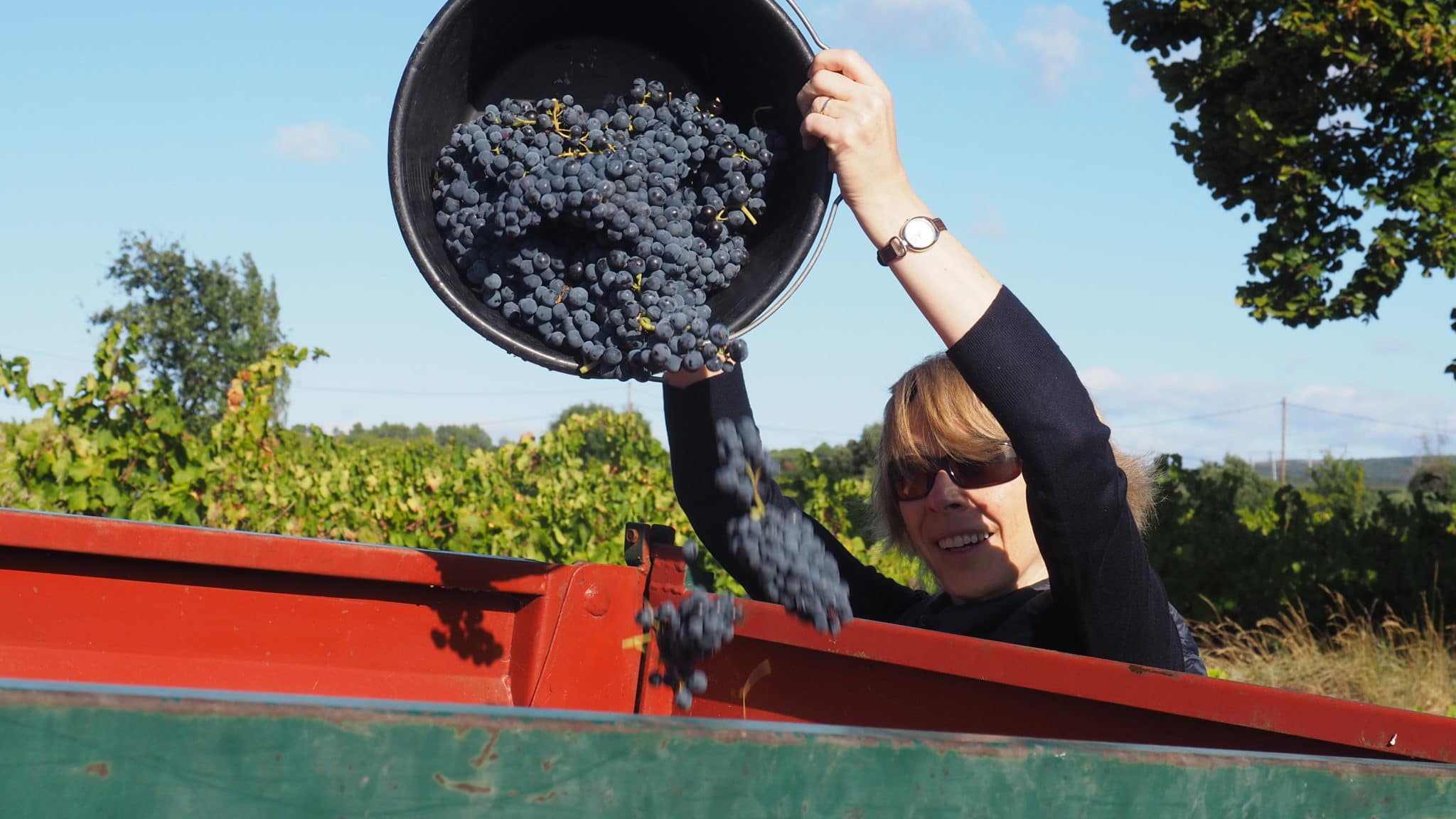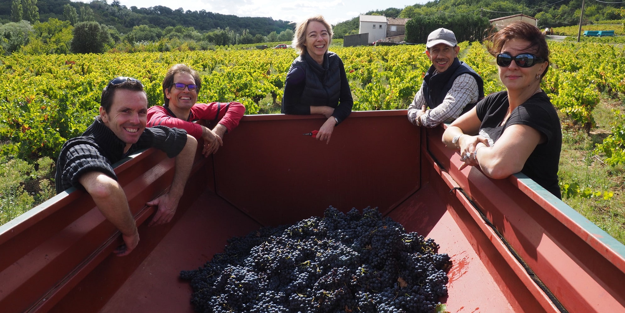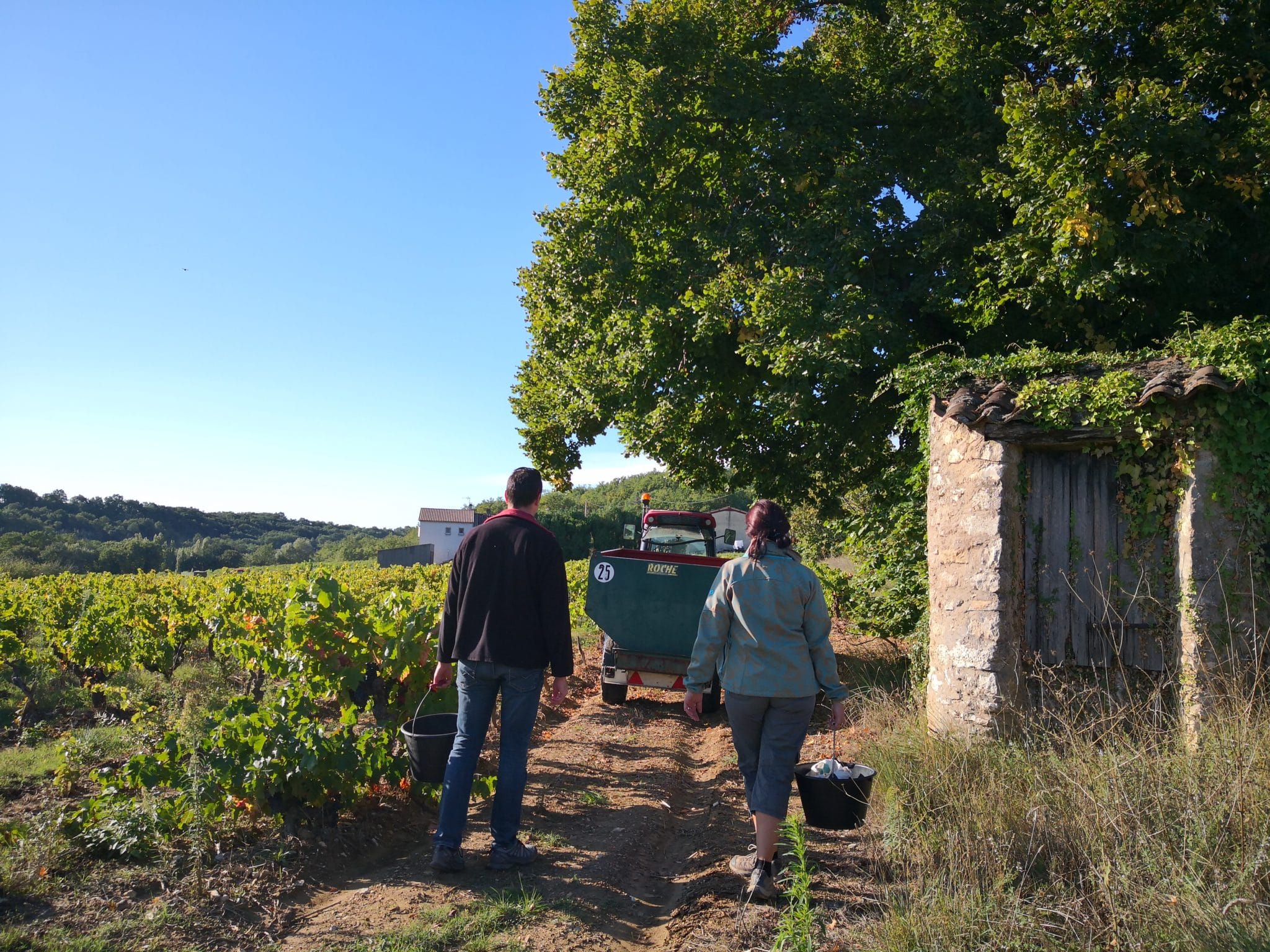 Bon, heureusement nous sommes plusieurs, certains vendangent plus vite que d’autres et nous remplissons quand même quelques seaux de ce délicieux Carignan, mûr à point. Le tracteur est toujours là, non loin, pour permettre de vider les grappes dans la benne. Au bout de deux heures, nous avons autant parlé, raconté, échangé, découvert et ri que ramassé de ce doux raisin, mais Frédéric nous indique qu’on a bien travaillé (vous imaginez bien que le volume n’y est pas !) et qu’on va pouvoir passer à la mise en cuve de notre micro-récolte.