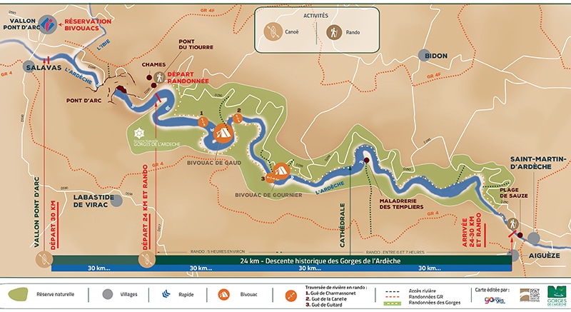 Avant de partir, il est indispensable de vérifier les conditions météo et le niveau d’eau pour les passages à gué en consultant le site www.vigicrue.fr ! Le niveau d’eau doit être inférieur à -0.7m pour partir de Châmes (inférieur à -0.3m en partant de Gournier vers Saint-Martin-d’Ardèche). Si vous dormez au bivouac de Gaud, le niveau d’eau doit être inférieur à -0.7m pour les 2 journées de marche. Si besoin, modifiez votre date de séjour ou annulez-la.