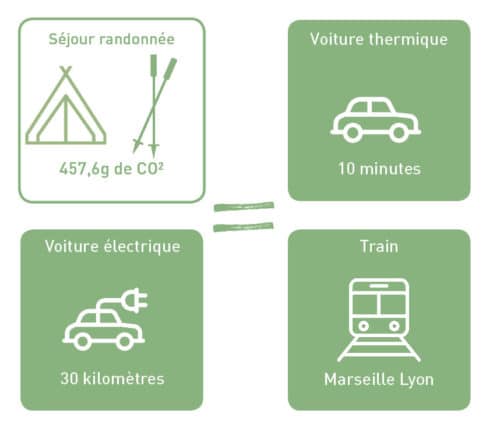Sachez que ce séjour génère seulement 457,6g de CO2 par personne, l’équivalent d’un parcours de 10 mn en voiture thermique, 30 km en voiture électrique et un trajet Marseille-Lyon en train.